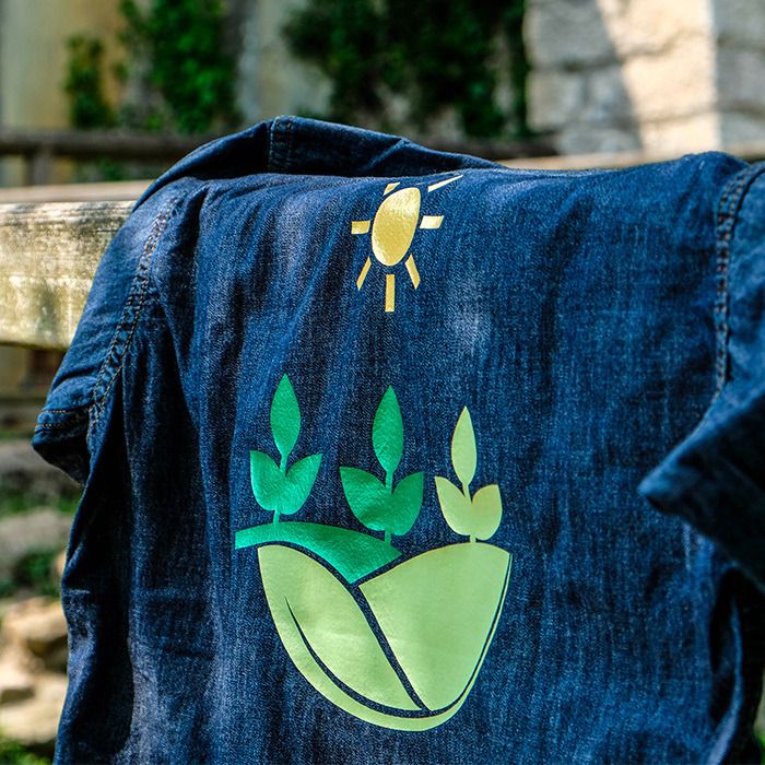 Plotter cut material with “electric” effect with adhesive polyester backing.